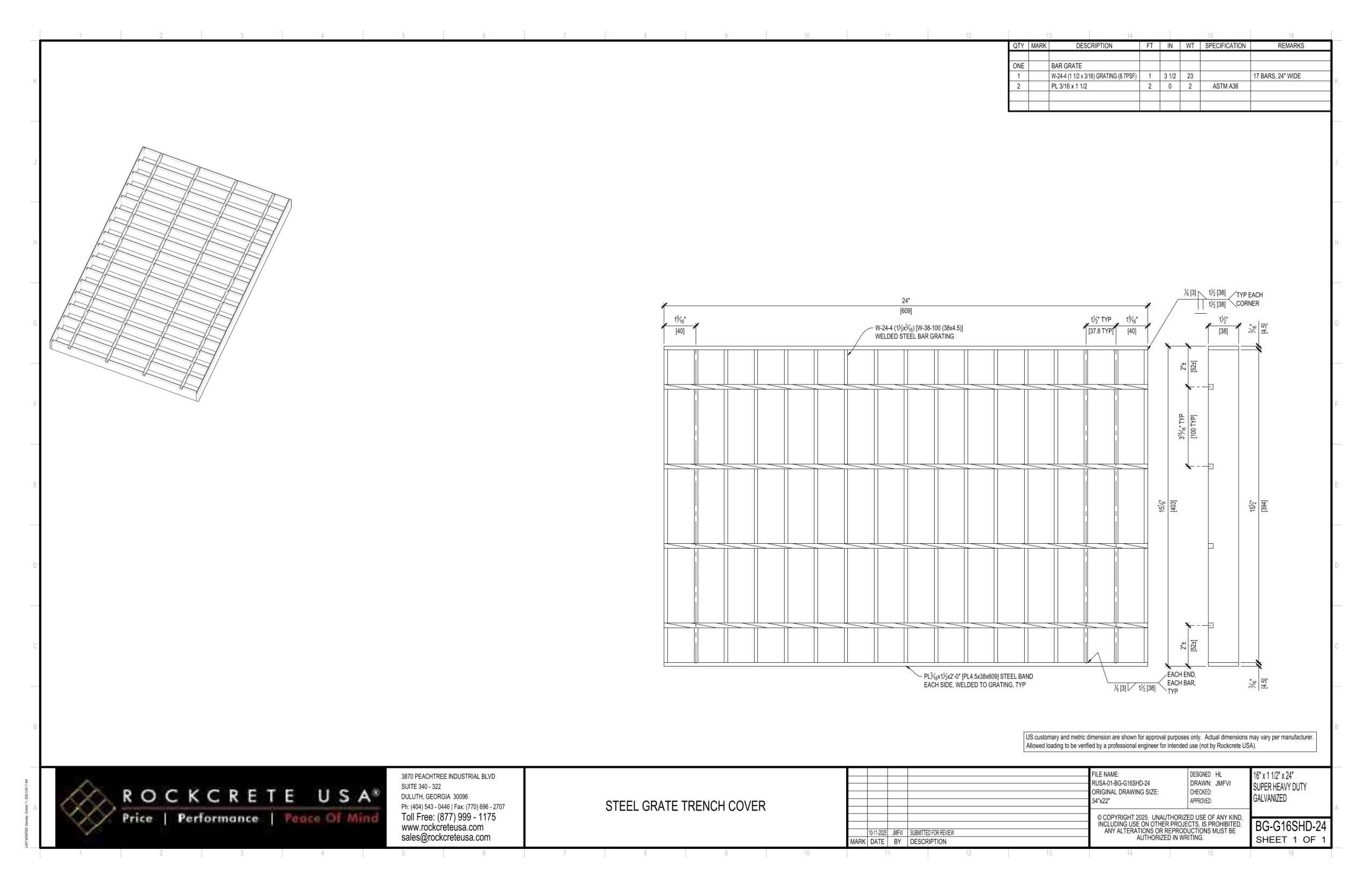16″x1.5″x24″ Galvanized Steel Trench Grate